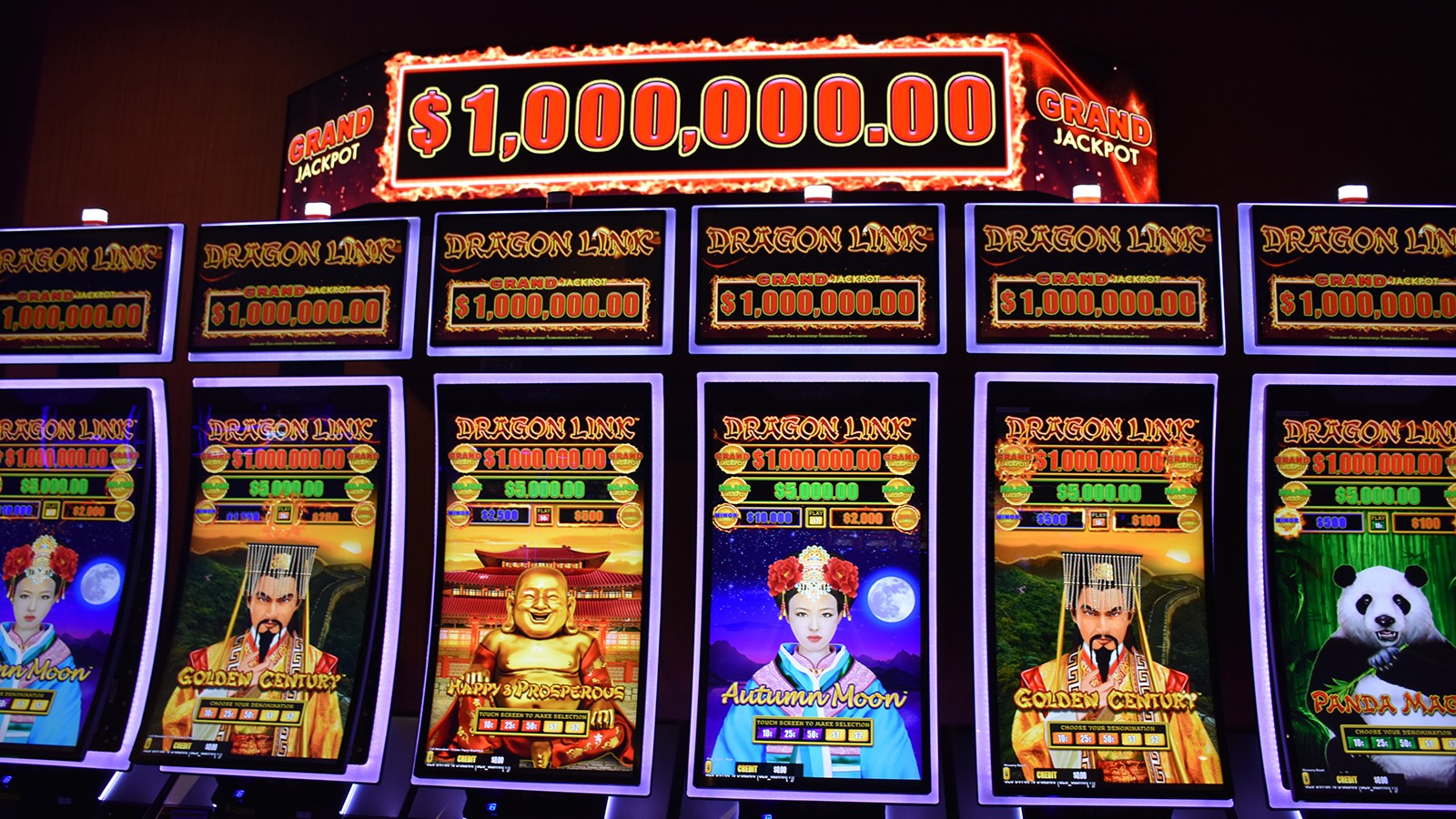 The $1 Million Dragon Link features four themes: Happy & Prosperous™, Golden Century™, Autumn Moon™, and Panda Magic™ on the MarsX™ Upright and has a $5 minimum bet and a $1,000 max bet.