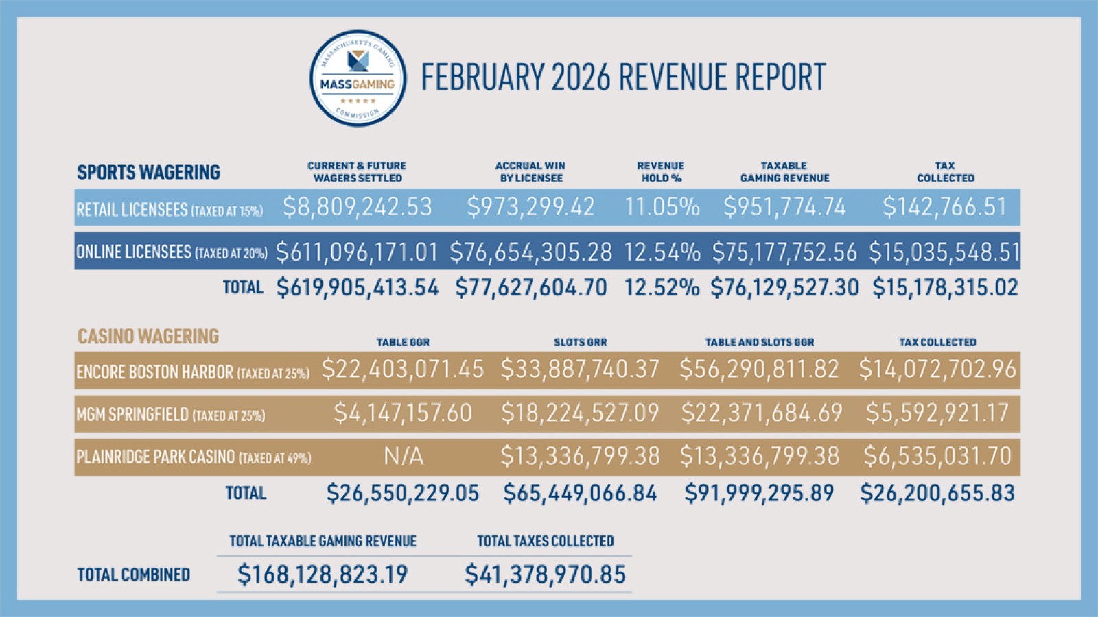 (Massachusetts).- State casinos and sportsbooks raked in $168 million in February, fueling state coffers with strong gaming and betting revenues.