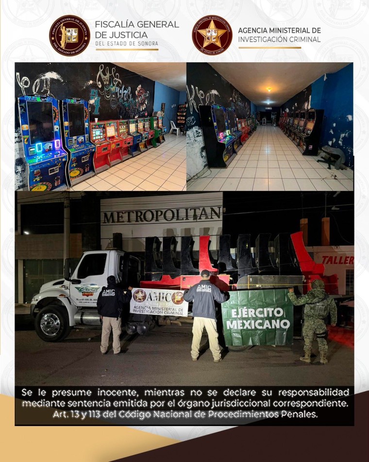 La Fiscalía General de Justicia del Estado de Sonora (FGJES), a través de la Agencia Ministerial de Investigación Criminal (AMIC) y en coordinación con la Secretaría de Seguridad y Protección Ciudadana (SSPC), la Secretaría de la Defensa Nacional (DEFENSA) y la Policía Estatal de Seguridad Pública (PESP), aseguró un total de 78 máquinas tragamonedas ilegales en distintos puntos del estado.