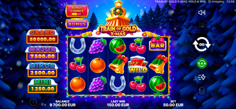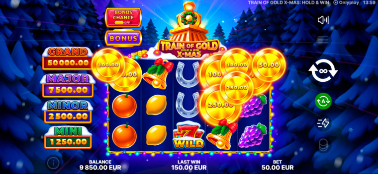Train of Gold X-Mas: Hold & Win es un alegre homenaje a la Navidad: vibrante, cálido y lleno de generosas sorpresas. Reúne el espíritu navideño, la emoción de las vías y la promesa dorada de la mecánica Hold & Win en un único viaje festivo. Todos a bordo del Christmas Express, donde cada giro lleva consigo el brillo de la magia invernal y la promesa de una deslumbrante fortuna navideña.